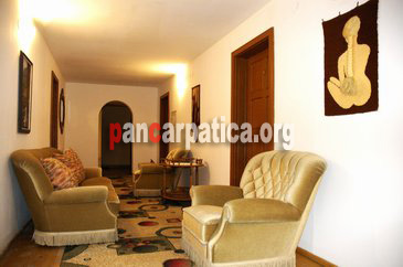 Imagine hol interior mare cu fotolii conforatbile si incapatoare si cu decoratiuni pe peretii interiori ai pensiunii Voichita din Frasin