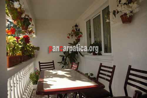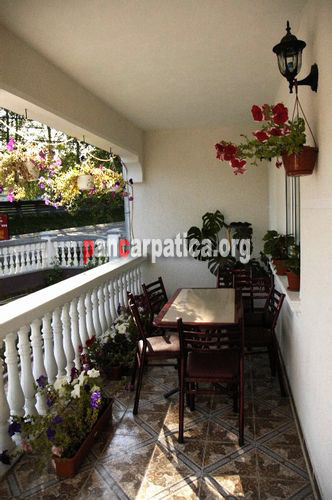 Imagine balcon frumos amenajat, cu masa si scaune in interiorul pensiunii Alex din Manastirea Humorului