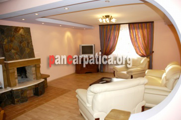 Imagine interior elegant si frumos amenajat cu semineu in pensiunea Madalina din Putna