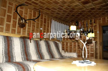 Imagine interior cu canapele acoperite de cergi, exponate vanatoresti ce decoreaza peretii la pensiunea Casa Cristi din Sucevita