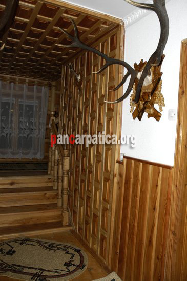 Imagine interior din lemn cu exponate de vanatoare ce decoreaza peretii pensiunii Casa Cristi din Sucevita
