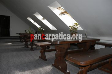 Imagine mansarda cu scaune si masa din lemn in interiorul pensiunii Casa Calin din Vama